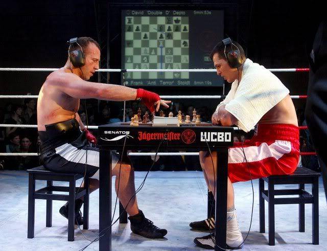 Nah untuk olahraga yang satu ini pastinya juga tidak kalah unik dengan yang pertama, Olahraga ini bernama Chess Boxing dari namanya saja pastinya kalian sudah bisa menebak bukan kalau olahraga ini adalah gabungan dari olahraga Catur dan Tinju, Chess Boxing ini seolah-olah untuk menunjukan kemampuan fisik sekaligus otak dalam waktu singkat dan cara bermain nya pun sangat unik yaitu di ronde pertama selama 2 menit untuk tinju dan 4 menit di ronde kedua untuk catur.